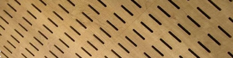 Panel absorbente para el revestimiento de paredes y techos. Perforaciones en forma de lágrima.Acabados altamente decorativos en madera. Se consigue mejorar el coeficiente de absorción instalando Acustifiber en la cámara de aire interior.
